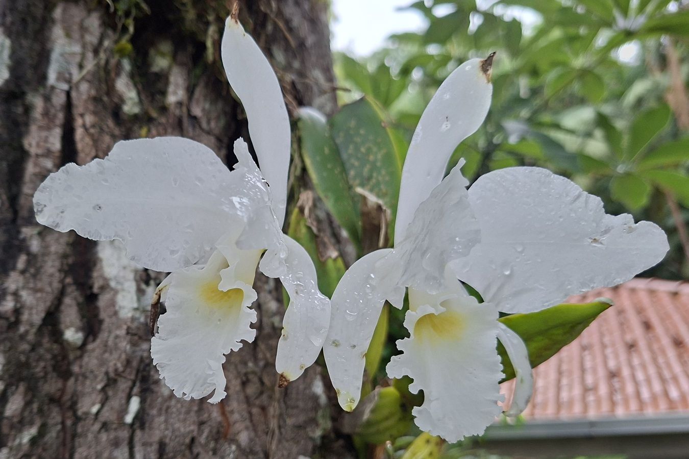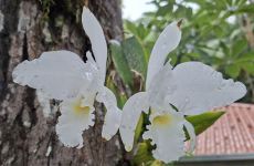 Na RPPN Santuário Rã-bugio esta orquídea Cattleya labiata variedade semi-alba "Cooksoniae" está sendo cultivada no tronco de um embiruçu (Pseudobombax grandiflorum) |